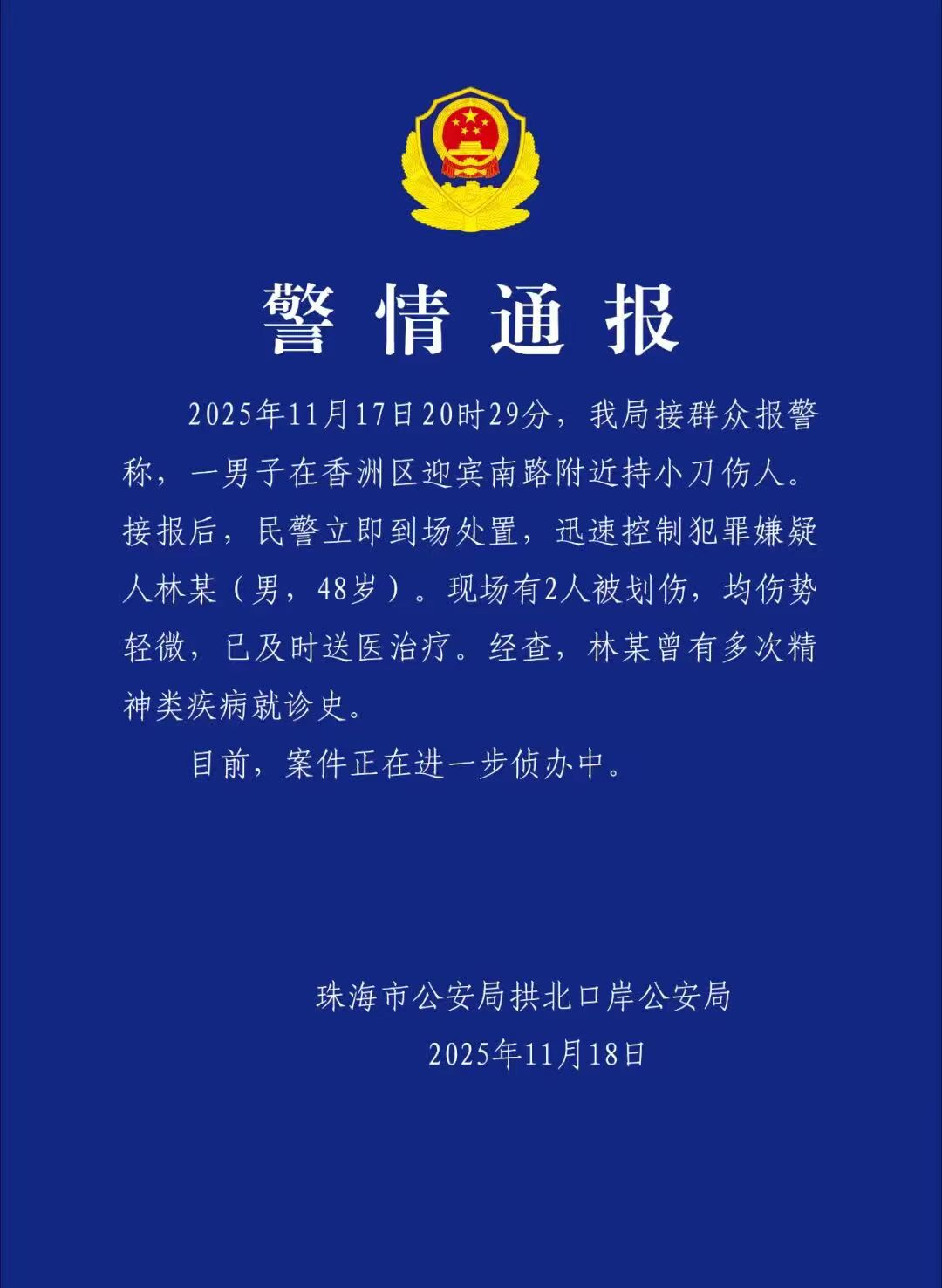 11月18日,珠海市公安局拱北口岸公安局发布警情通报:2025年11月17日20时29分,我局接群众报警称,一男子在香洲区迎宾南路附近持小刀伤人。接报后,民警立即到场处置,迅速控制犯罪嫌疑人林某(男,48岁)。现场有2人被划伤网上配资_配资炒股,均伤势轻微,已及时送医治疗。经查,林某曾有多次精神类疾病就诊史。目前,案件正在进一步侦办中。